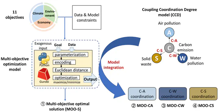 Promoting socioeconomic development while curbing carbon emission and pollutants necessitates a balance among multiple conflicting objectives. Structural adjustments to industrial production and energy consumption can better balance the economy, climate and environment systems and achieve balanced development of multiple objectives. In this study, we propose a novel optimization method by integrating the coupling coordination degree model into traditional multi-objective optimization model and apply it to Jiangsu Province, China. Through industrial restructuring and energy transition, we design three pathways to achieve coordinated development of economy, climate, and environment from 2018 to 2030. Under these three pathways, Jiangsu is expected to support an average annual GDP growth of 6.80 % with an annual increase in energy consumption and carbon emissions of merely 2.57 % and 1.76 %, while significantly reducing environmental pollutants such as AN and NOx by 22.7 % and 16.4 % every year. Results indicate that the integration of the coupling coordination degree model can effectively improve the performance of the traditional optimization model, achieving better results at a lower cost. At the same time, it significantly enhances the coordination between different objectives, resulting in lower carbon emissions and higher environmental pollutant reductions by 2030. It is expected this improved model can provide support for real world decision-making and planning to facilitate more integrated development of economy, climate, and environment.